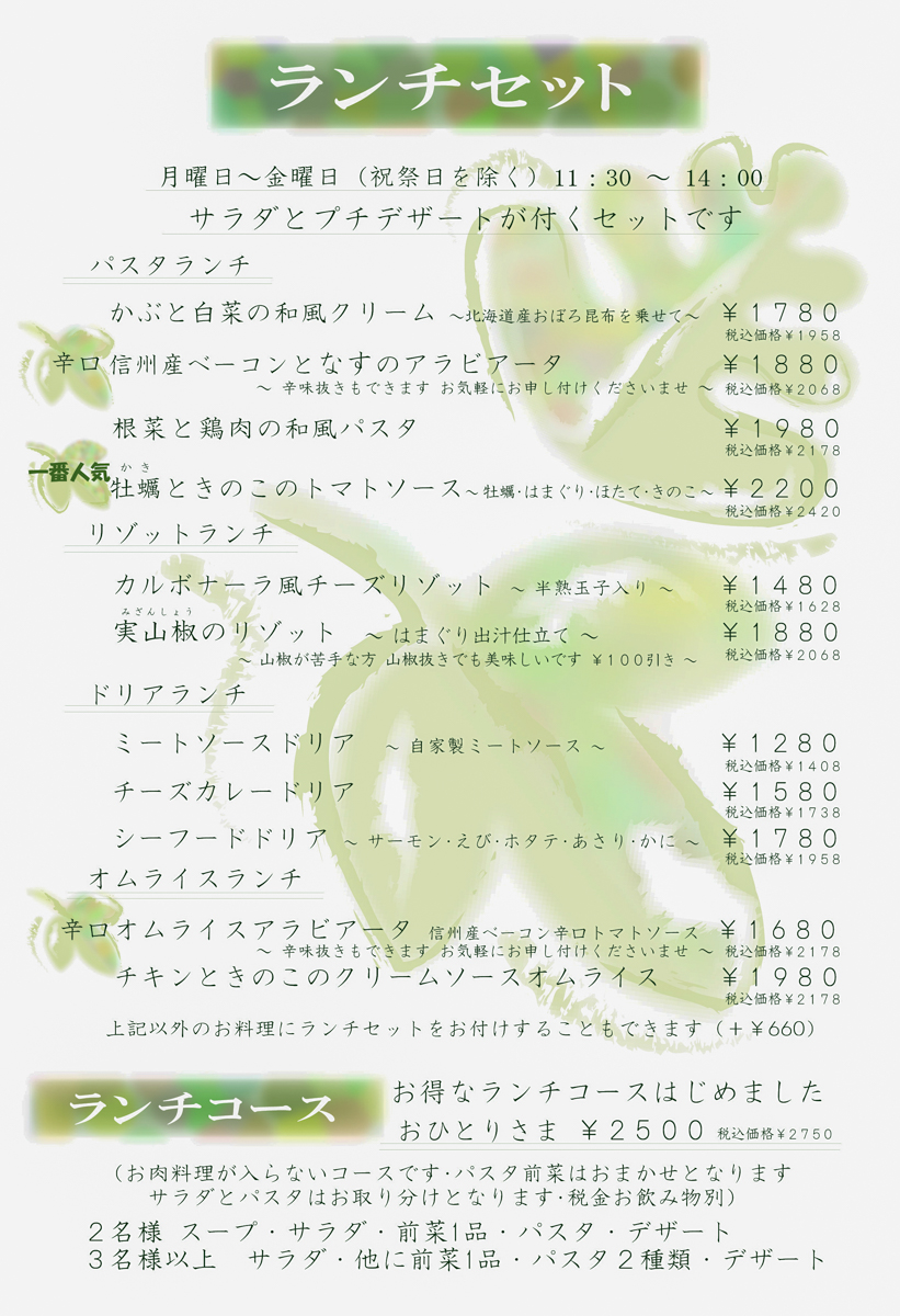 (お肉料理が入らないコースです・パスタ前菜はおまかせとなります・サラダとパスタはお取り分けとなります・税金お飲み物別)